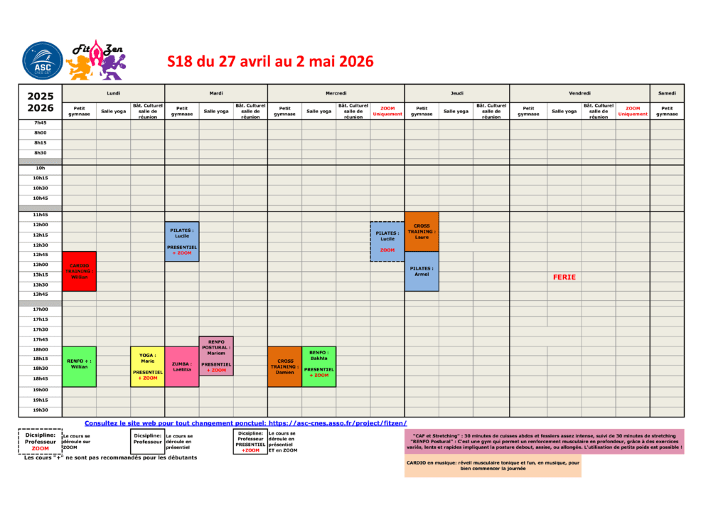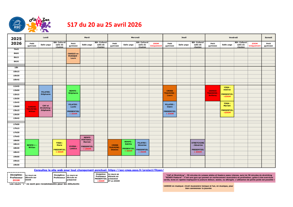 * Il est possible de s’inscrire en cours d’année. Contactez le bureau (FitZen.ASC@cnes.fr) pour en connaître les modalités.